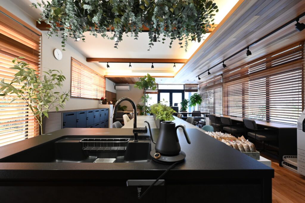 電気ケトルやシンクを備え、休憩時のコーヒータイムや軽食準備にも活用できます。