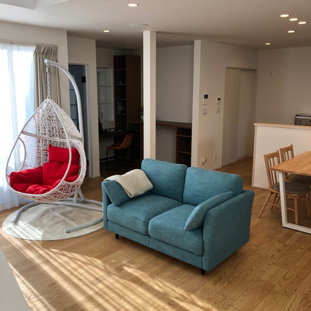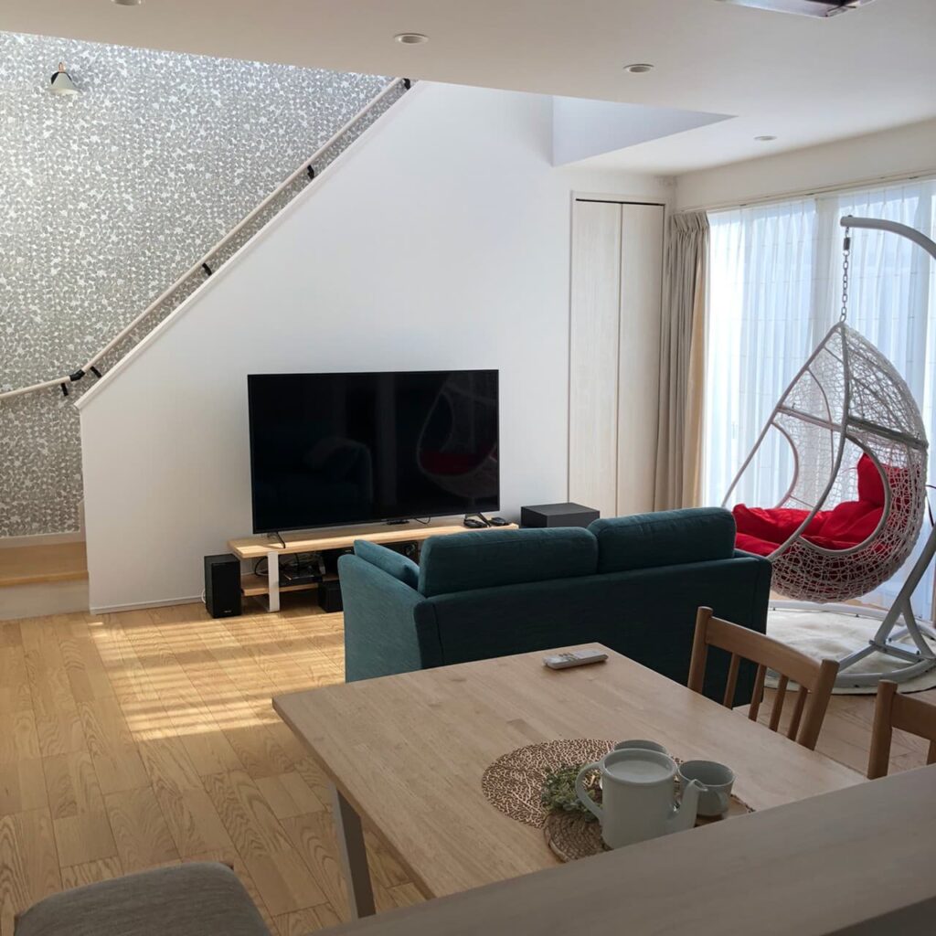 ゆったりと設置された大画面TVやハンギングチェアが、家族のリラックスタイムを豊かにしてくれます。